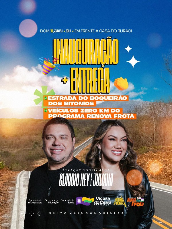 A partir das 9h, em frente à casa do Juraci. Venha comemorar a nova estrada e a renovação da frota municipal com muito ritmo.