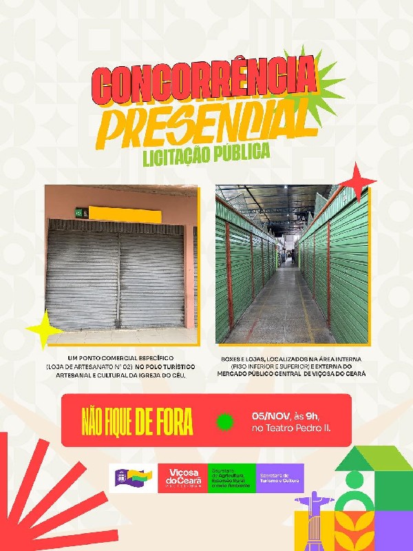 A concorrência presencial para boxes e lojas ocorre dia 05/11, às 9h, no Teatro Pedro II. Garanta sua oportunidade de investir no crescimento de Viçosa!