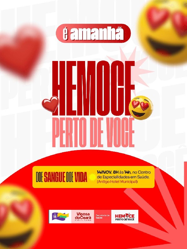 É amanhã! Campanha "Hemoce Perto de Você" acontece nesta sexta (14) em Viçosa do Ceará.