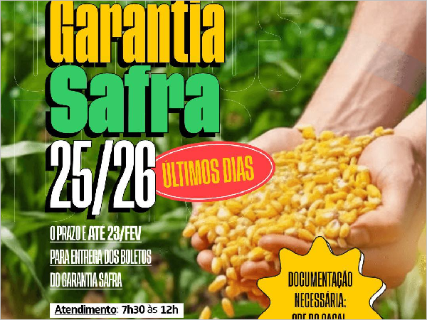 20-02-2026Agricultores de Viçosa do Ceará devem comparecer à Secretaria de Agricultura para garantir o benefício portando o CPF do casal.