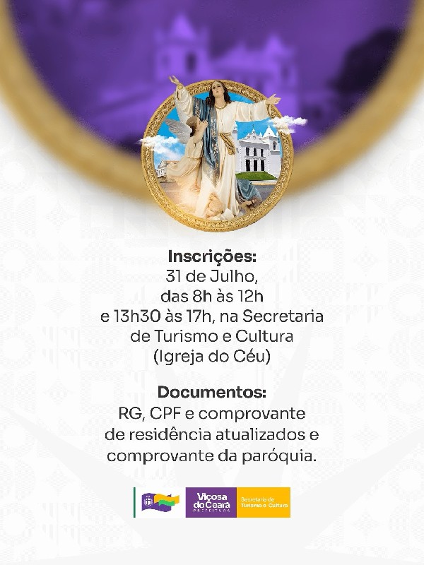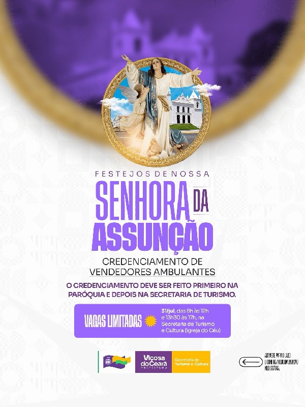 Vagas limitadas! Garanta sua licença para os Festejos da Assunção. Procure a Paróquia e finalize seu credenciamento na Secretaria de Turismo no dia 31 de julho.