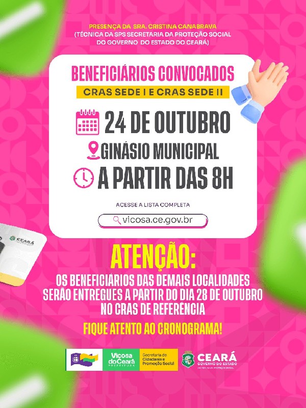 A lista dos contemplados do CRAS Sede I e II já está disponível! A entrega será no Ginásio Municipal, a partir das 8h. Demais localidades recebem a partir do dia 28.