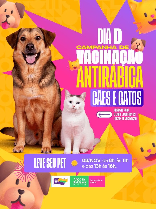 Dia D de Vacinação Antirrábica! Proteja seu cão e seu gato no dia 08 de novembro.