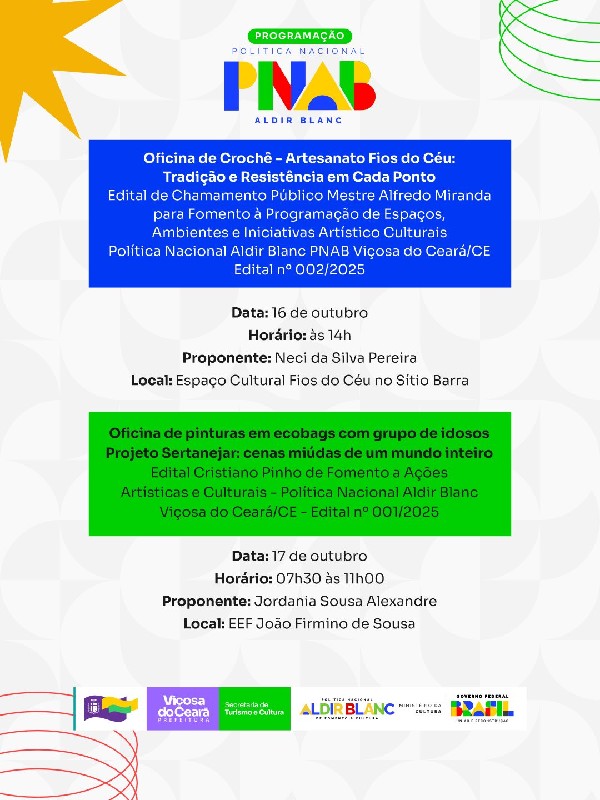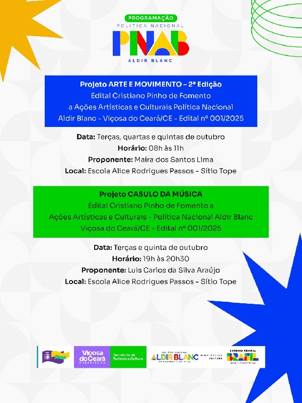 A iniciativa fortalece artistas e fazedores de cultura do nosso município. Arraste para o lado, confira a programação completa de outubro e participe!